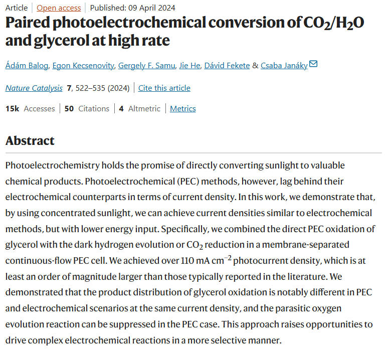 The researchers demonstrated that using concentrated sunlight enables high reaction rates during photoelectrochemical glycerol oxidation, while maintaining product selectivity and system stability compared to measurements performed with 1 Sun illumination (the average intensity of sunlight reaching the Earth's surface). At the same time, the electrical energy required to achieve identical current densities can be significantly reduced compared to dark electrochemical reactions.